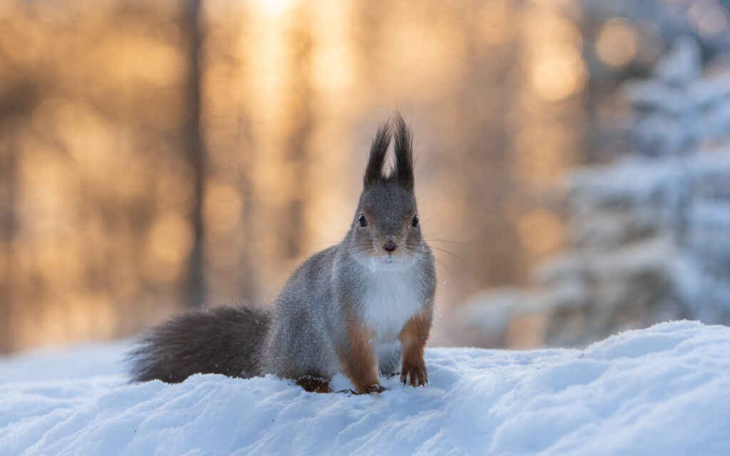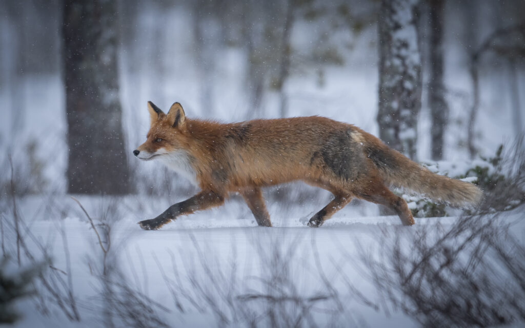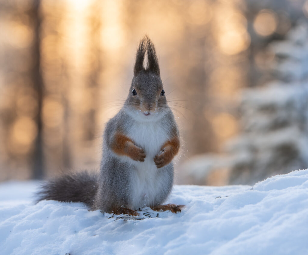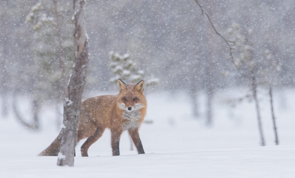 It is possible to photograph golden eagle, goshawk, red fox and red squirrel. There are smaller birds that are frequent visitors such as bullfinch, greenfinch, great tit, blue tit, willow tit, common redpoll, common jay, great spotted woodpecker, grey-headed woodpecker, magpie and raven. Other species are rare but sometimes show such as waxwing, snow bunting.
